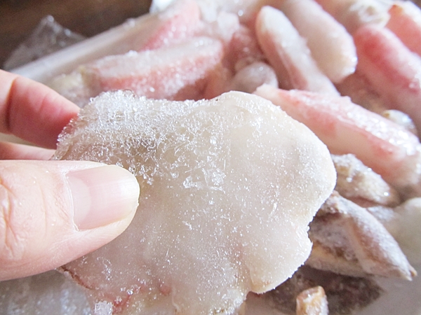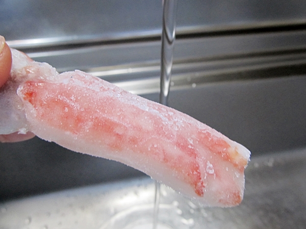 キレイに並べて冷凍されてくるカニ足のむき身ポーションは、パックを開けて流水に流すだけで食べられるのですんごく便利です。